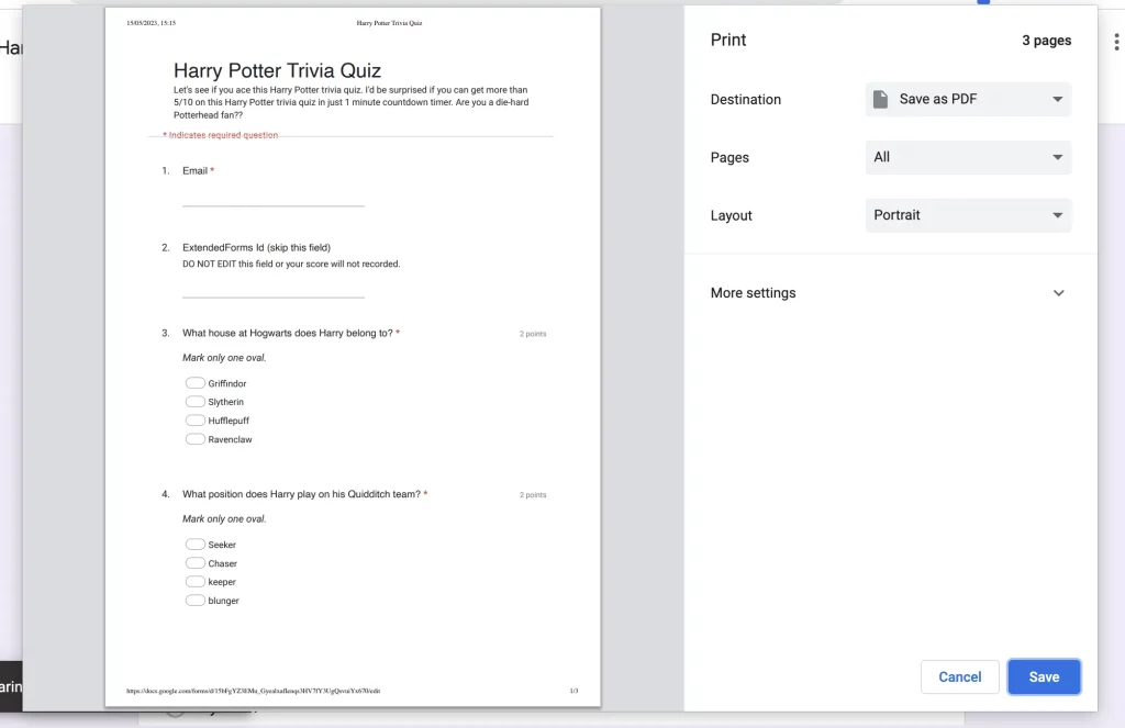 Yes, users can convert or save Google Forms to PDF by clicking on CTRL/ Command + P. Or by navigating to More > Print > Save as PDF. Apart from this, users can also save only responses as a PDF. You can check out this article to know in detail – How to Convert Google Forms to PDF. (4 ways)