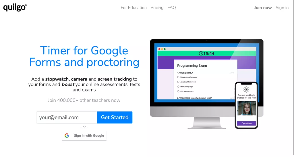 Quilgo is an excellent timer and proctoring app designed specifically for Google Forms. It brings time limits and automated proctoring to your online tests, exams, and assessments, elevating the overall experience. With Quilgo, you can easily incorporate a timer directly into your Google Forms, taking your basic quizzes as comprehensive online assessments.