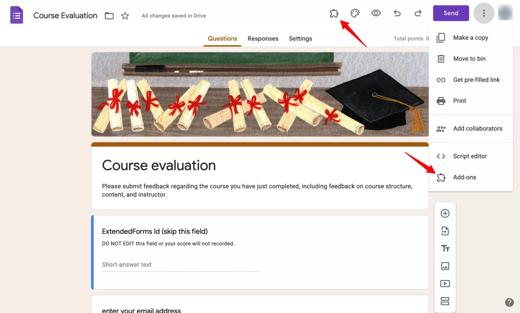To install any add-ons, Go to ‘More’ in the upper right corner and go to Add-ons. A pop-up window will open with addons that work with forms. Check them out and install any of them. Once you have added any add-ons, you’ll find them at the top of the form in puzzle shape. Add-ons will help you to work more efficiently and create automated systems. There are many good add-ons, here is one of the best timer add-ons that I know: