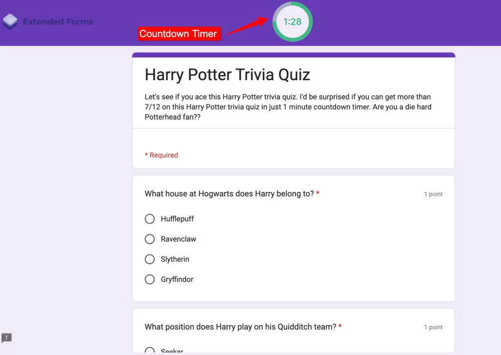 ExtendedForms is the best Google Form timer, add a one-click countdown timer and turn your google forms into google tests and quizzes. The app is a perfect alternative to Quilgo, Form Timer, or any other google forms timer extension. It doesn’t require any heavy configurations, you have to just install the addon and configure the very basic settings. The forms are timer enabled! The app has so many features that just enhance the work of ExtendedForms.