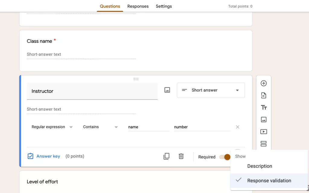 Another cool feature that we have in Google Forms so that you can obtain honest responses in Google Forms – Response Validation. It is a feature that helps users create rules that responses have to follow while filling out the form. For instance, you can ask for an email address and make sure they submit properly formatted email ids. Just choose response validation, and specify the validation for eg – email, also if you want you can add custom error text that will be shown to students if they make such sort of an error.